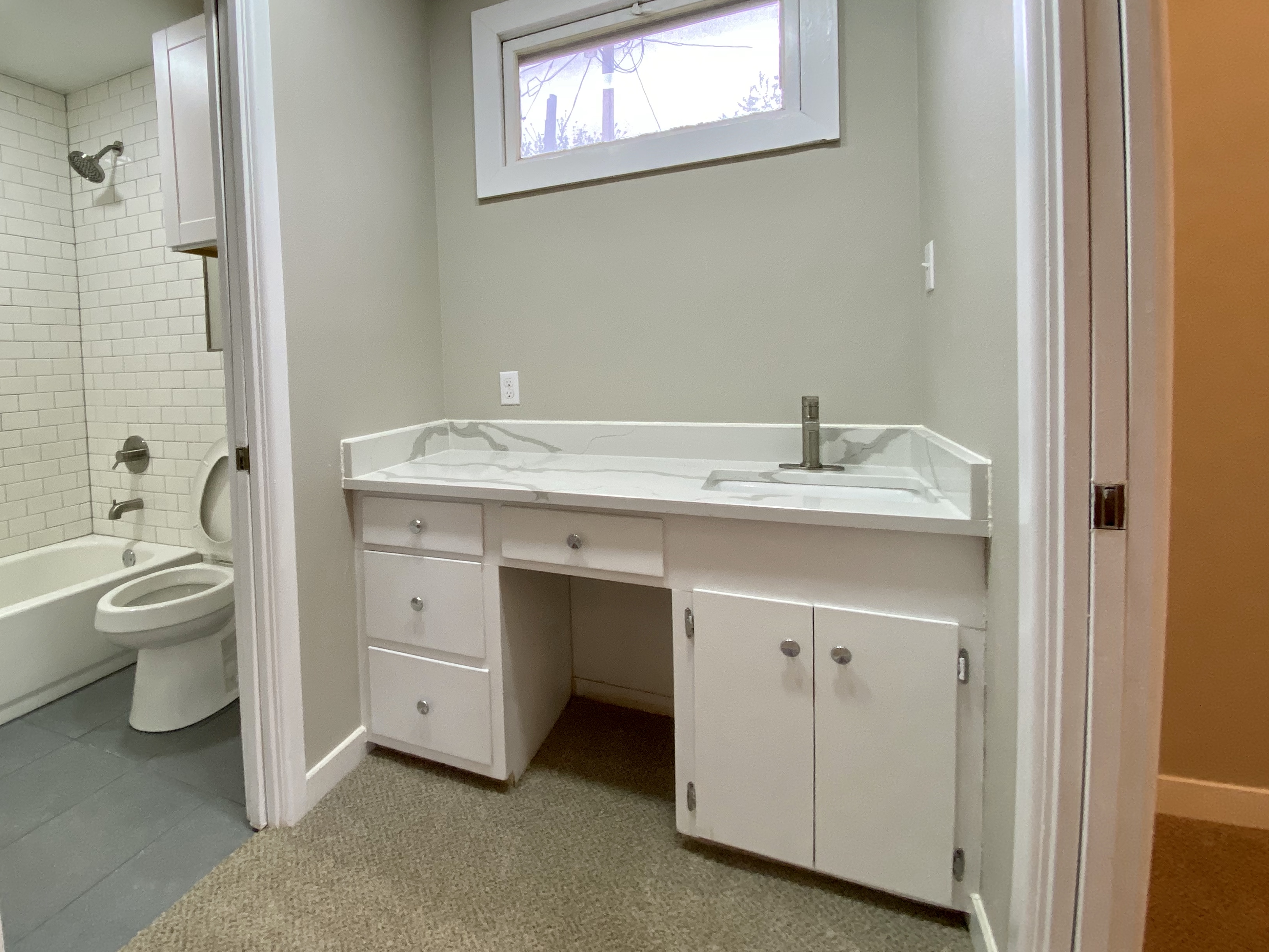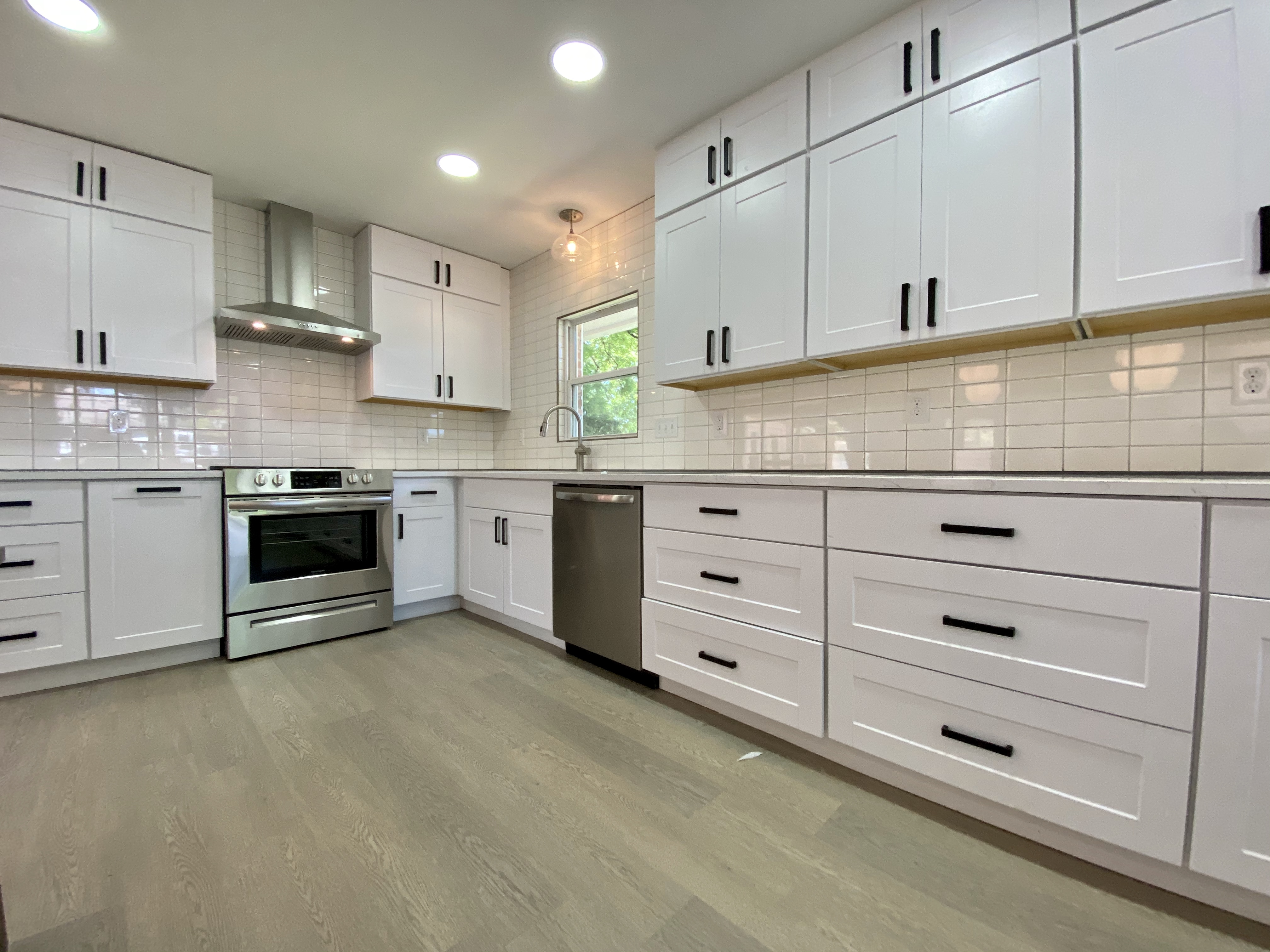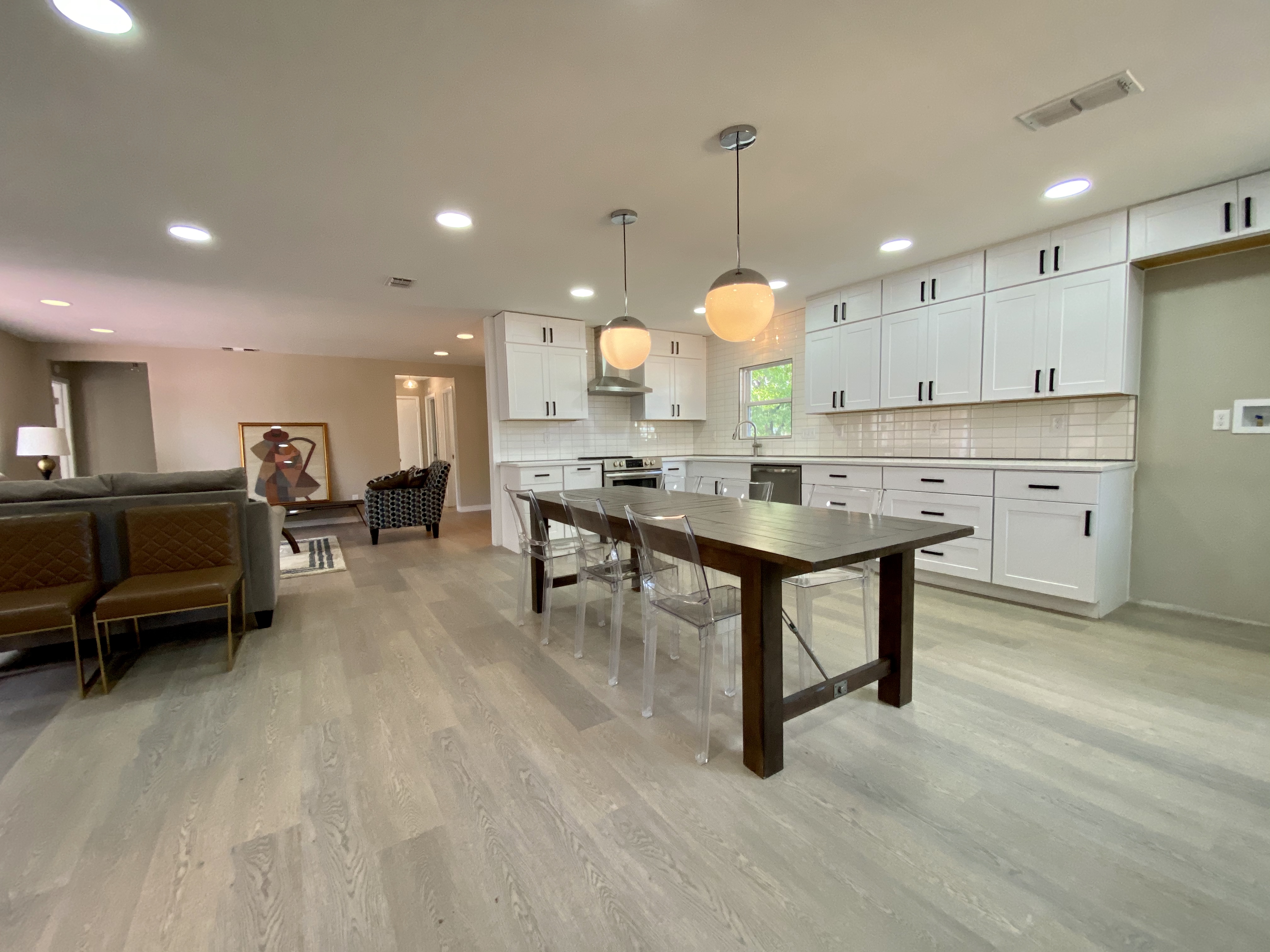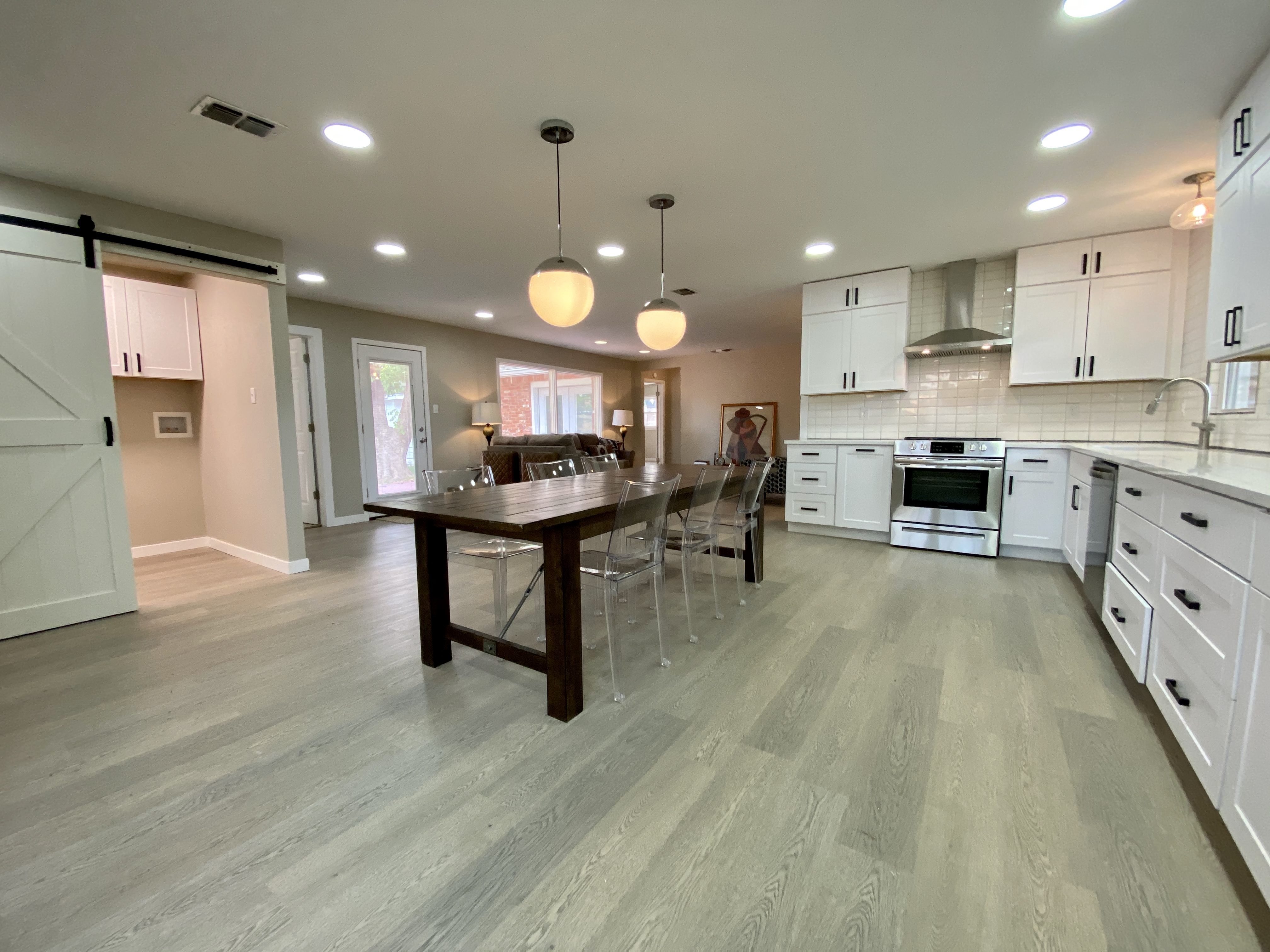 Revisions were made to the floor plan to resolve these issues. Laminate flooring was used in the public areas, halls and baths to unify the floor plan. The kitchen was reoriented on two walls and designed to complement a large family dining area that was integrated with a flexible, open living area. Bathrooms were updated with subway tile and bedrooms got new panel doors and carpet. The result was an open, livable floor plan that maximized the square footage of this house.